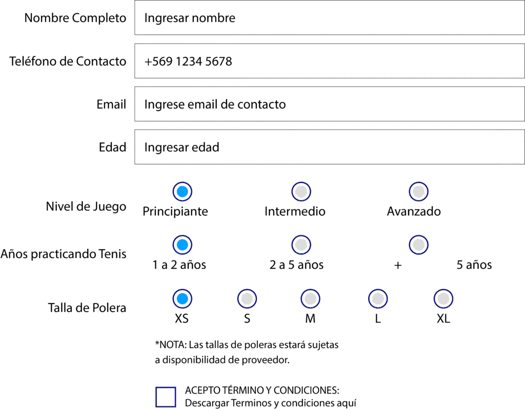 Llena los datos del inscrito. Esto nos servirá para poder organizar los grupos de trabajo mejorar la experiencia de Carlos Alcaraz Academy Camp.